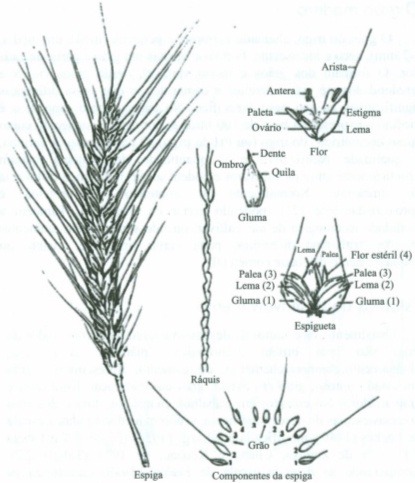 A inflorescência do trigo se apresenta na forma de uma espiga composta, formada por espiguetas alternadas e opostas na ráquis.